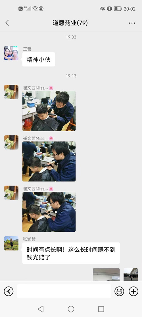 這兩天道恩藥業(yè)工作群里被一段段理發(fā)的視頻和搞笑的評論刷屏了。視頻里的“理發(fā)師”是道恩藥業(yè)生產(chǎn)總監王學(xué)智,他拿著(zhù)電動(dòng)推子全神貫注為員工理發(fā),每一下都十分認真,不放過(guò)任何一個(gè)細節;被理發(fā)的“頹廢少年”秒變“精神小伙”;圍觀(guān)群眾打趣到:“服務(wù)這么長(cháng)時(shí)間卻賺不到錢(qián),光賠了。”理發(fā)現場(chǎng)的氣氛十分融洽,隔著(zhù)屏幕都能讓我們感受到那份歡快。