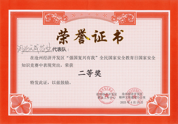 滄州經(jīng)濟開(kāi)發(fā)區舉辦“強國復興有我”國家安全知識競賽活動(dòng) 天成藥業(yè)代表隊榮獲二等獎