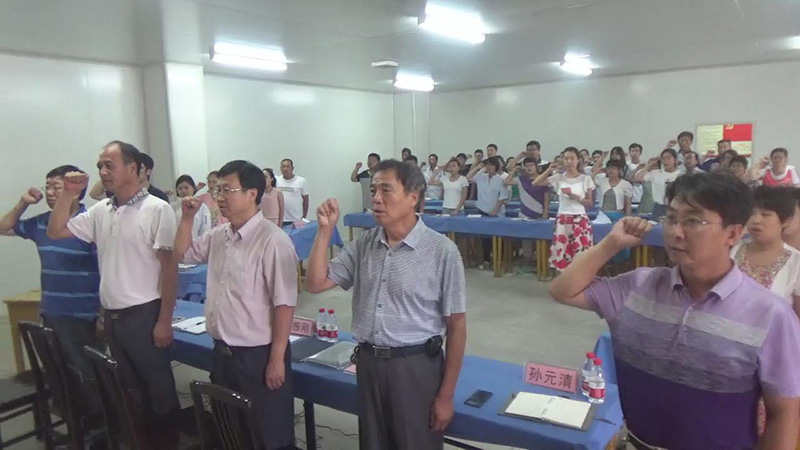 大會(huì )開(kāi)始,全體黨員起立,高唱國歌,面對黨旗重溫誓詞莊嚴宣誓。