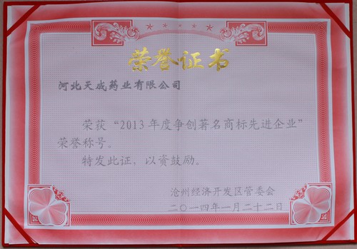 2014年榮獲“2013年度爭創(chuàng )著(zhù)名商標先進(jìn)企業(yè)”榮譽(yù)稱(chēng)號